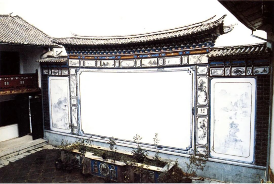照壁也是纳西族民居建筑装饰焦点所在,有的围以泥塑花饰边框,有的在照壁顶部及两侧用薄砖分出框档,再镶嵌石块装饰