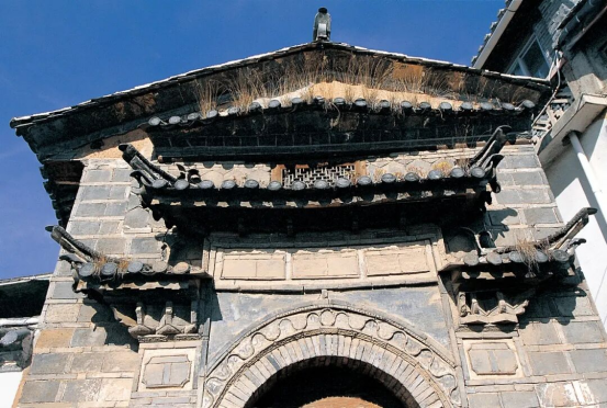 白族民居的门楼更是白族民居建筑的重点和一大特色,门楼院门用砖和石砌成拱券门,拱券门头常用大理石镶刻显示家风及身份的文字,左右两边用大理石或青石砌门座,之上是青砖砖柱。门楼又分为出阁式和平头式两种,出阁式门楼的装饰性较强,其上是木结构殿阁式造型,往往斗拱重叠,顶部筒板瓦做成层挑檐,端部翘起,飞檐串角。出阁式门楼又以中间高两边低的“三滴水”门楼装饰最为精美,大门、瓦檐裙板和门楣都有精美的木雕,门座也有石雕图案,门柱用大理石镶嵌。大理城小街遍布的如凤凰振翅欲飞的门楼,是苍山洱海的美丽一景。