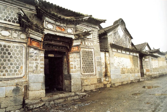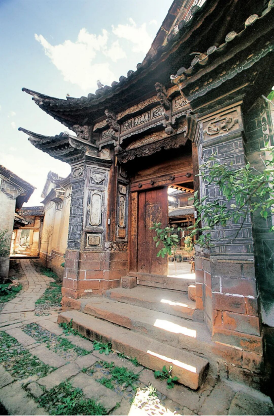白族民居大门多漆青黑色,灰砖以白色勾缝,有线和面的对比