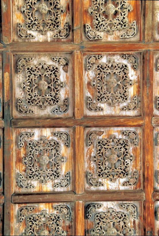 天花按构造、做法不同可分为井口天花和海墁天花。井口天花是在顶部用木料搭建一层网状方格,描有彩画,每一方格内便放置一块正方形的天花板,上面施有精美的彩画,有的沥粉贴金,雍容华贵。海墁天花的构造较简单,即用木条钉成方格网架,悬于顶上,在方格木框下面满糊棉榜纸、高丽纸或绢,讲究的在上面绘制精美的彩画。