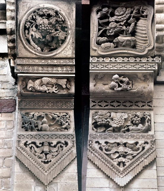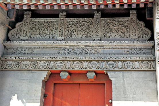 在民间富有特色的是胡同里的四合院门楼。大栅栏商铺的门楼,天津的杨柳青大宅院的大小门楼,都有北方风格大气的砖雕,以朴实、庄重、简洁、典雅为特点,砖雕题材主要以自然花草类、吉祥图案类、博古锦文类、蕃草图案类为主,尤其以“福”、“禄”、“寿”三种题材更为常见,表达了京都人对福、寿、官禄的追求和渴望。砖雕除主要用于各种门楼、山墙和影壁等处,其他部位也有相应做砖雕装饰的,如透风、瓦头、滴水、墀头等。