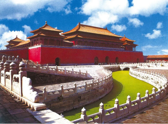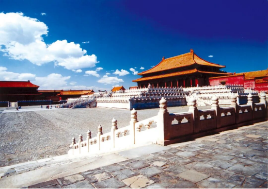 白色台基、红墙黄瓦与蓝天、白云交相辉映