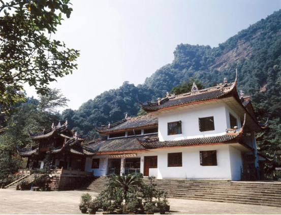 其二,继承文脉,色彩淡雅,摈弃浮华。道家朴实无华、清净淡雅的理念,导致道教宫观建筑与佛教建筑形态有很大不同,它大多采用民居建筑风格,色彩素雅,黑、白、灰和赭红是建筑的主色调。屋面多采用小青瓦,基本不用琉璃。这一道家学说已影响四川境内的其它传统公共建筑衙署、祠堂、书院等,一般都采用不施斗拱的“小式建筑”,形制近于民居,是四川城乡建筑的主体风格。