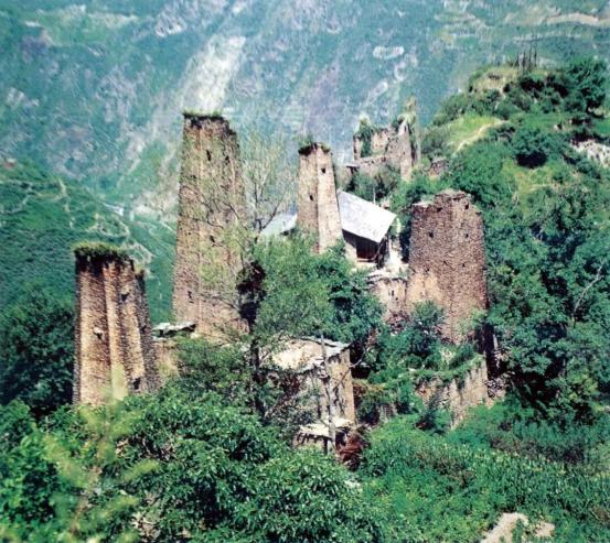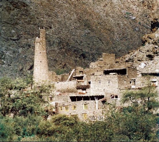 羌族石块垒成的高高雕房直刺青天雕房石片磊筑,只开小窗,墙体粗粝傲然斑剥