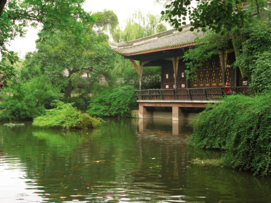 其三、文人造园品位高雅,诗歌点景,相得益彰。巴蜀地域山川灵秀,文风鼎盛,诞生过孔子的老师长弘,汉赋大师司马相如、西蜀孔子杨雄、三国志》作者陈寿、唐代诗仙李白、宋代苏东坡父子、明代状元杨升庵等。“自古诗人例入蜀”,给四川留下了许多刻有文人烙印的建筑和园林,其中尤以园林建筑为最,形成了园林界公认的“川派园林”。中国唯一尚存的唐代园林——新繁李卫公东湖;宋代陆游任蜀州通判时的官署后园——崇州罨画池和苏东坡家族祠堂发展成的眉山三苏祠;明代状元杨升庵读书处发展而成的新都桂湖;为纪念唐代女诗人薛涛而建的成都望江楼;唐代诗圣流寓成都时的故地——杜甫草堂及武侯祠等古典园林,因其布局典雅、建筑朴实、廊腰漫回、造园手法独具特色而享誉海内外。