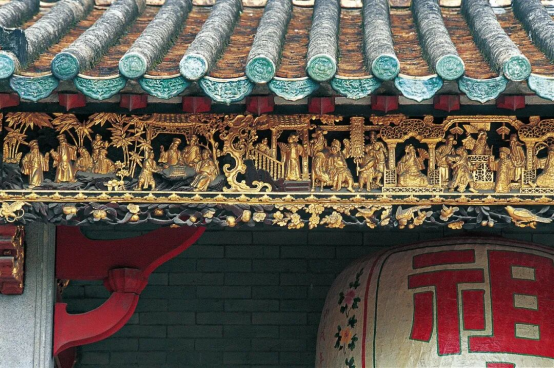 潮州己略黄公祠是岭南地区建筑雕刻的宝库,此为门廊梁架木雕、石雕