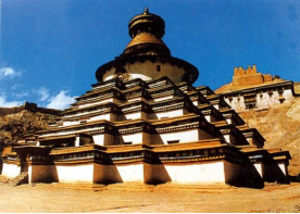 西藏江孜白居寺大菩提塔,九层四面十二角,共有108个门和76间龛室,龛室内有佛像和壁画