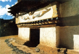 民居建筑西藏人的住宅用“碉楼”来称呼是最确当不过了。它都是通体稳重、敦实、封闭的二或三层的土石木结构小楼,方形平顶,平顶略微错开造成体块搭接,高低错落。它的开间很小,都是若干小间的搭接,因为在崎岖的山区,驮运木材都要用马,所以木材无法太长。二、三楼常用木材接出外廊,与石墙土顶形成材质对比,别具一格。藏人习惯大片厚石墙刷上粉或涂红,墙外的楼檐楞木上涂以朱、蓝、黄、绿、青等各色,深嵌墙内的梯形小窗漆成黑色,对比十分强烈,是粗犷的西南藏地高原风情。藏族地区也有居住帐篷的,帐篷是由牛毛编的粗毛毡搭盖而成,颜色都是黑的,远远望去象一片黑色的盖,在苍穹之下广阔无垠。