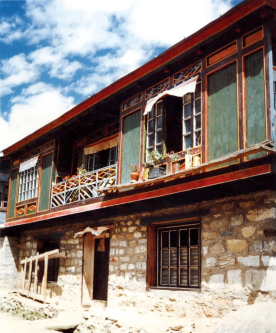 西藏亚东民居用木材接出外廊,与石墙形成材质对比,别具一格