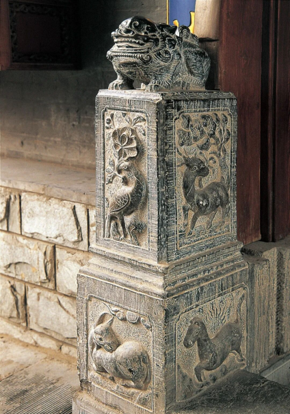 整个门枕石由一块整石雕刻而成,纹饰图案从人物、动物、植物、博古、云纹、盘长结无所不包,尽呈吉祥福瑞,同时为大门增添了坚固和端庄之美。